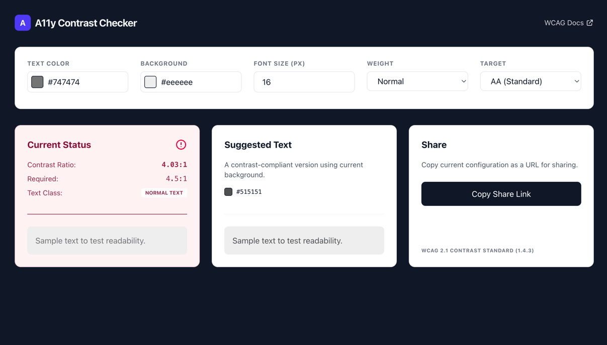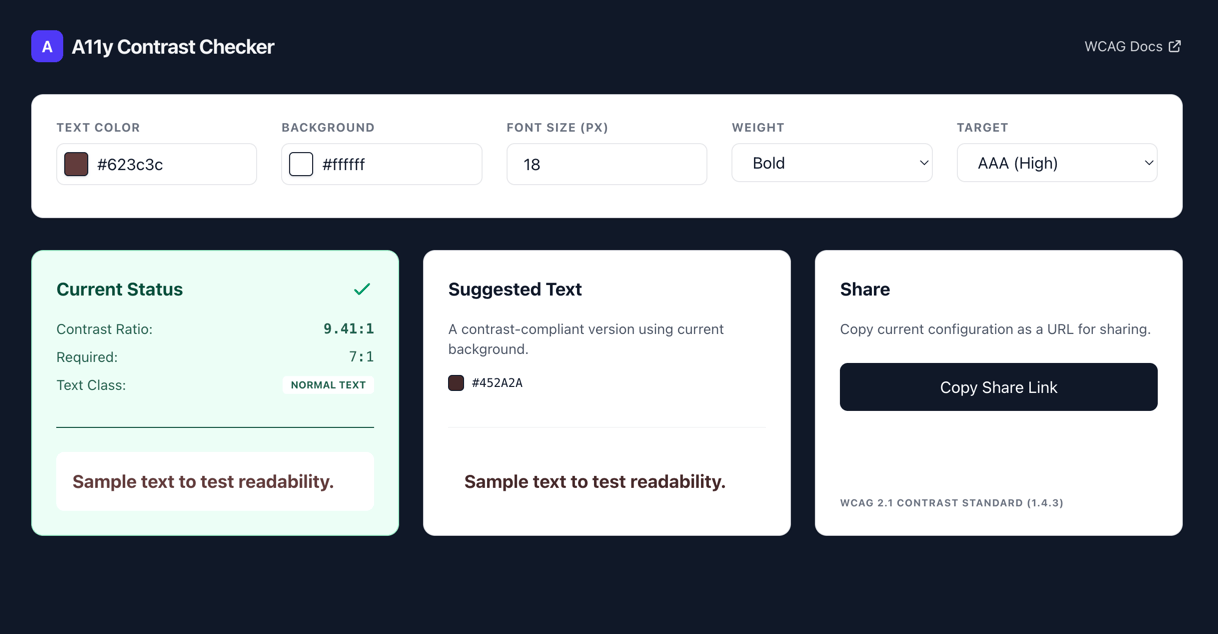 I recently updated my a11y accessibility checker tool with improved accuracy, better logic, and a more polished user experience. This tool helps designers and developers ensure their color combinations meet WCAG accessibility standards.